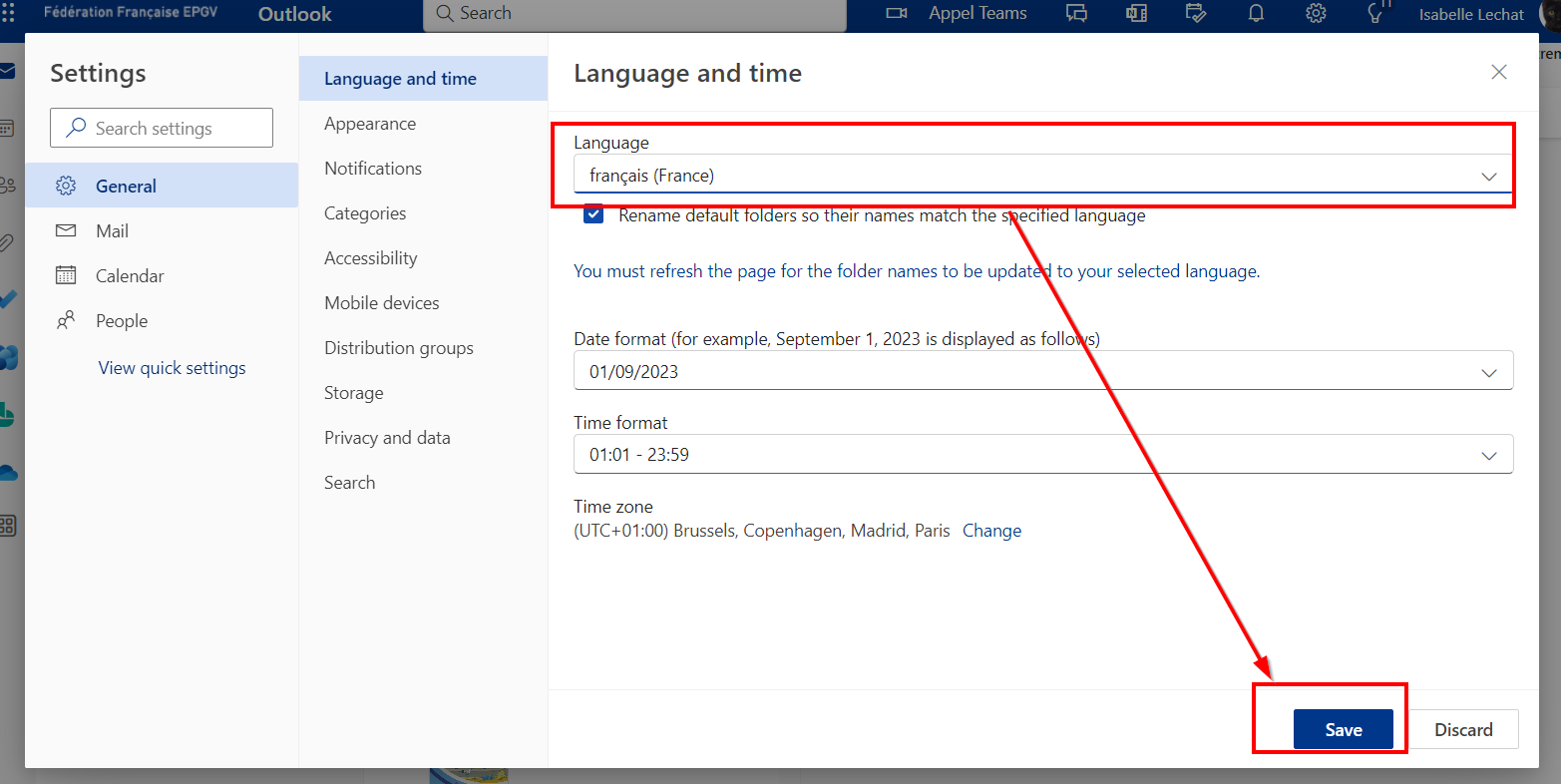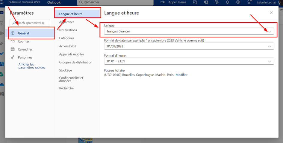 Dans la fenêtre qui s'affiche, sélectionnez Général, puis Langues et Heure (General, Language and time).