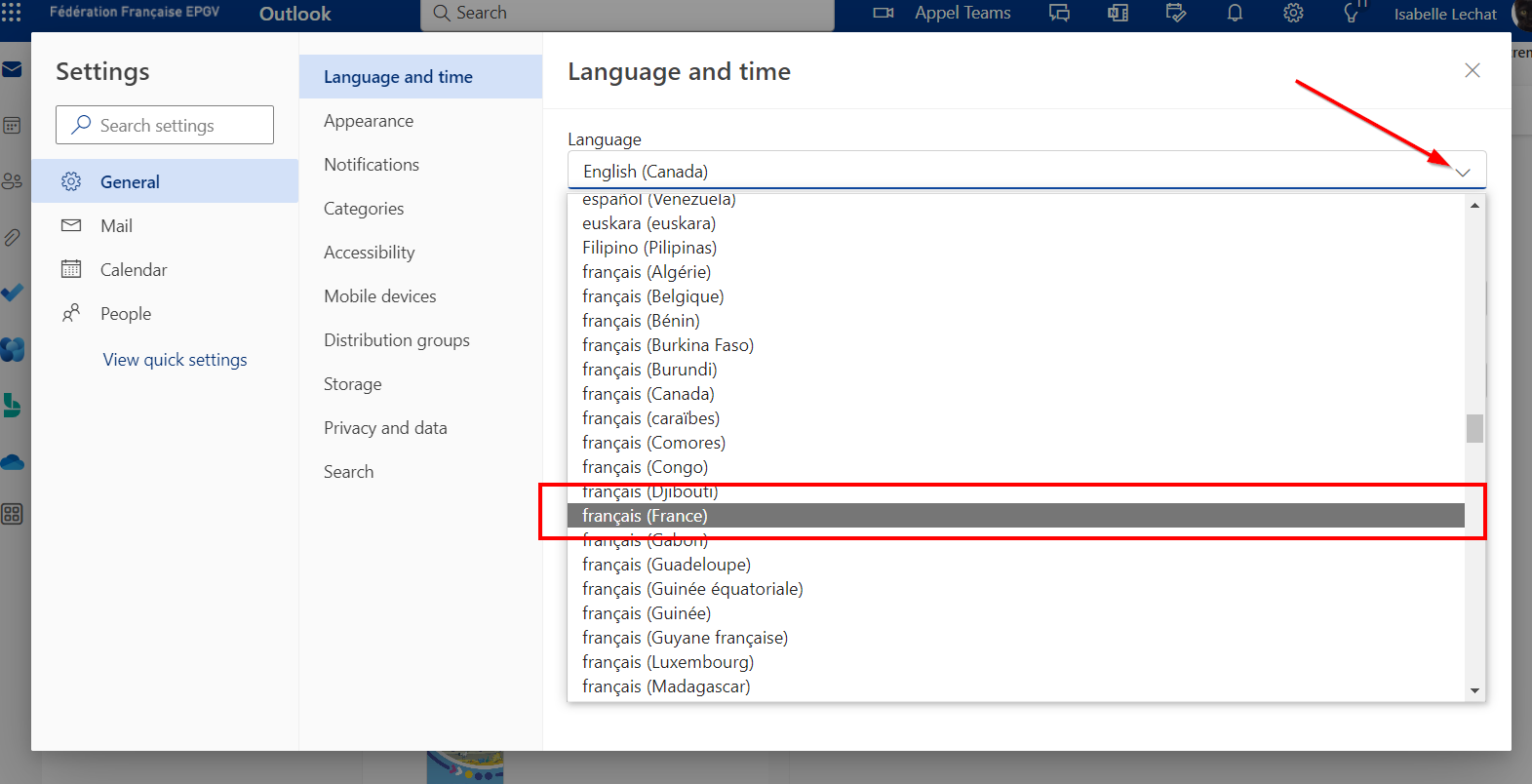 Ensuite, cliquez sur le menu déroulant Langue et choisissez la langue dans laquelle vous voulez avoir Outlook.
