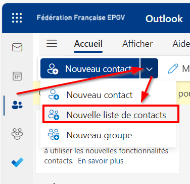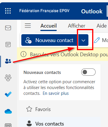 Cliquez sur la flèche descendante à côté de Nouveau Contact