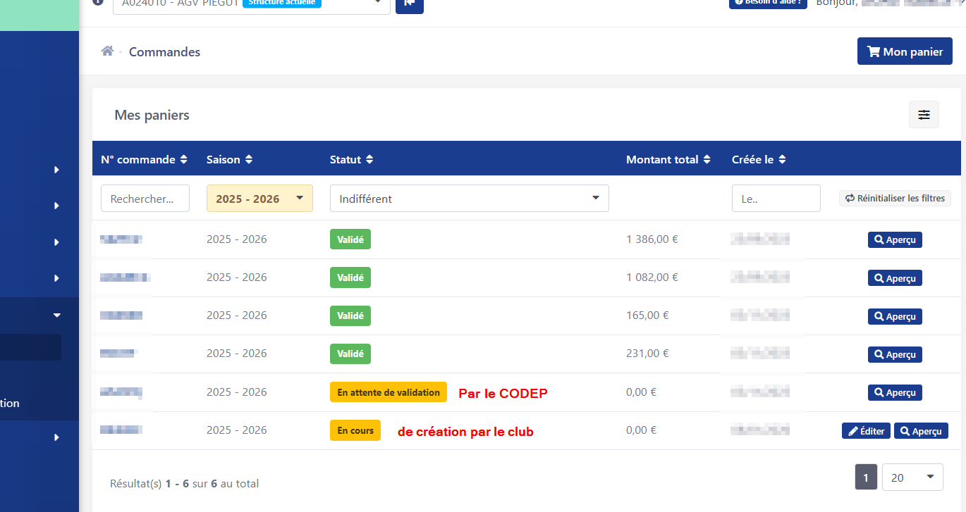 Panier "En attente de validation" : le panier a été envoyé au CODEP. Le club ne peut plus agir dessus. Le CODEP validera le panier à la réception du paiement.